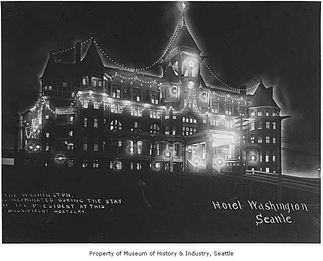 Hotel Washington decorated for visit of President Theodore Roosevelt, Seattle, 1903. Museum of History & Industry Photograph Collection Image Number SHS 7921.