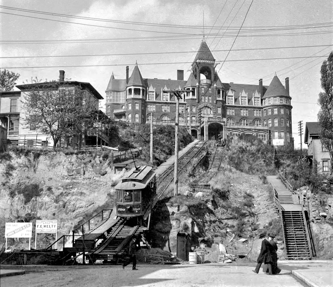 Washington Hotel circa 1903, showing the tram which would carry guests up from the street. Photo courtesy of MOHAI.