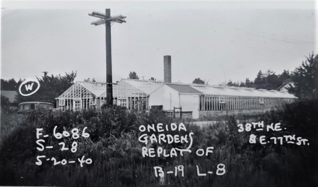 Theusen’s greenhouses at 7707 38th Ave NE (northwest corner of the intersection) for the Lily of the Valley Garden business. Oneida Gardens is the plat name of these blocks.