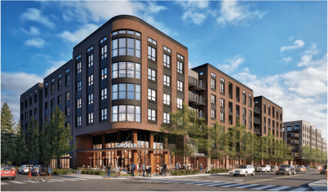 The Security Properties plan is that the Wedgwood Shopping Center would be redeveloped, with all of the present buildings demolished. The current tentative plan shown here, views the property from the corner of NE 85th Street. The plan shows a grocery store which would take the place of the former QFC on the site. (It closed on April 24, 2021.) In September 2025 it was announced that the Town & Country Grocery company would be the grocer in this new complex.