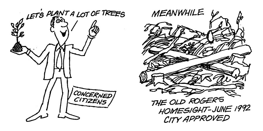 In 1992 Bob Cram drew this cartoon to illustrate the need to preserve trees in the Maple Creek ravine area.