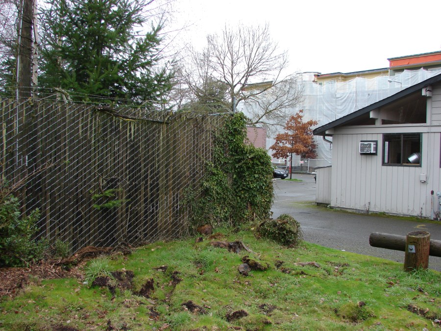 The potential park space at 8605 35th Ave NE currently has an old electrical substation (fenced, at left) and a hair salon. In the background across 35th Ave NE can be seen the new Jasper Apartment building.