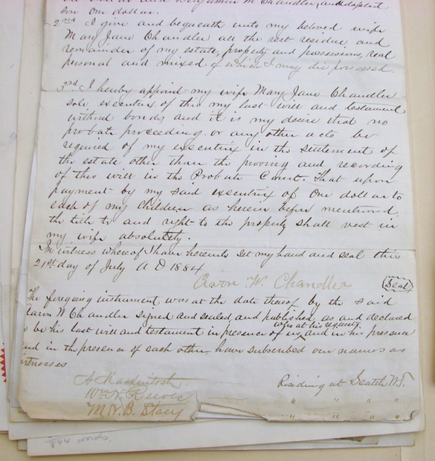 Aaron W. Chandler’s signature and that of his witness can be seen on the will he wrote on July 21, 1884, less than five months before he died. Original document kept at the Puget Sound Regional Archives, Bellevue, WA.