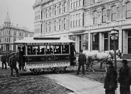 Horse-drawn streetcar service began in downtown Seattle in 1884, and electric streetcars came a few years later. Photo courtesy of Paul Dorpat’s web extras of 3/18/2012.