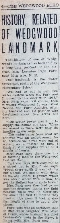 “History Related of Wedgwood Landmark,” Wedgwood Echo, July 24, 1956, page 4.