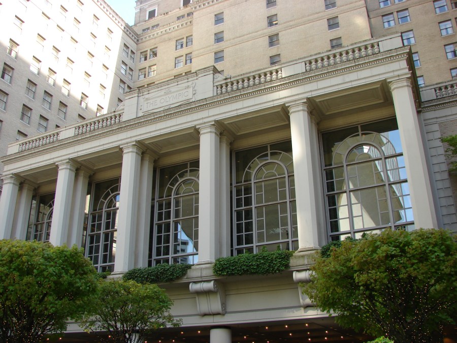 The Fairmont Olympic Hotel at 4th and University Streets in downtown Seattle is on the original site of the University of Washington, founded in 1861.