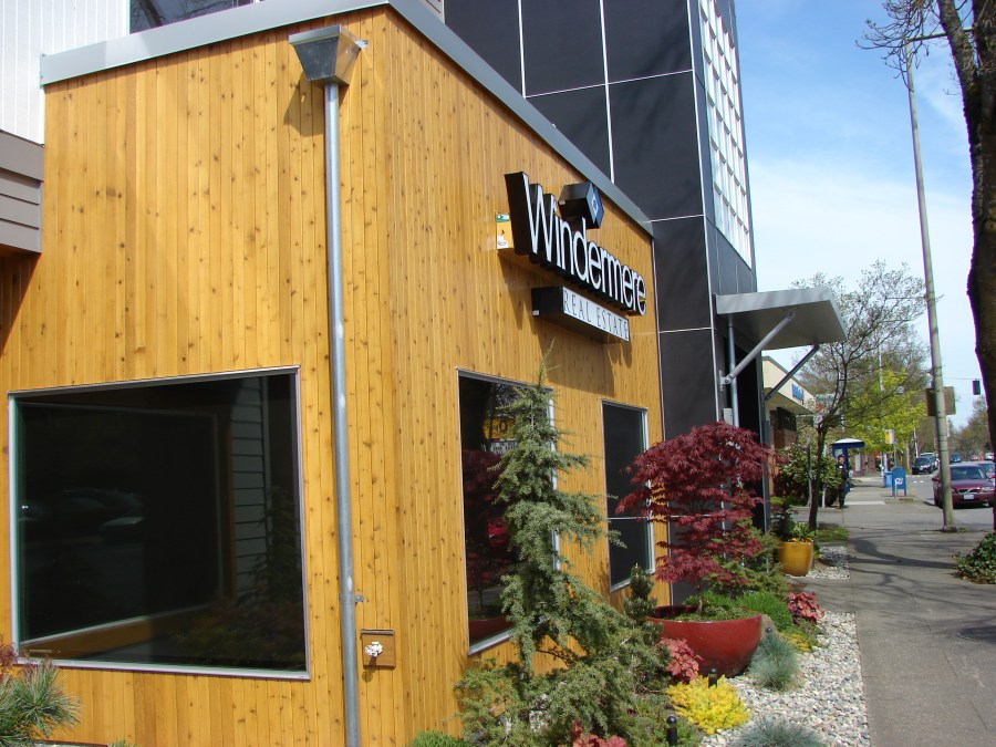 Looking north on 35th Ave NE, the remodelled Windermere Real Estate building at NE 84th Street appears as though made of boxes of varying shapes, stacked along the sidewalk.
