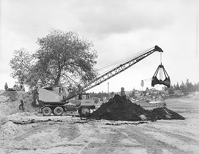 By 1956 some areas of Dahl Playfield could be used, but work was ongoing (looking north.) Photo courtesy of Seattle Municipal Archives.