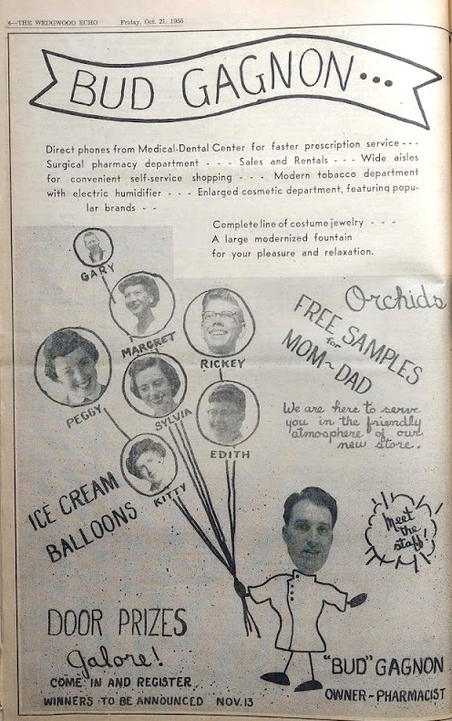 What a great article, thank you for writing it! My mother worked at both Wedgewood Pharmacies in the 1950s and 1960s. The Gagnons were wonderful people. I will never forget that on the day of my mother’s funeral, Bud Gagnon closed the Pharmacy and the readerboard out front paid tribute to her. In the 1950s and 1960s, Wedgwood was a small close-knit community.