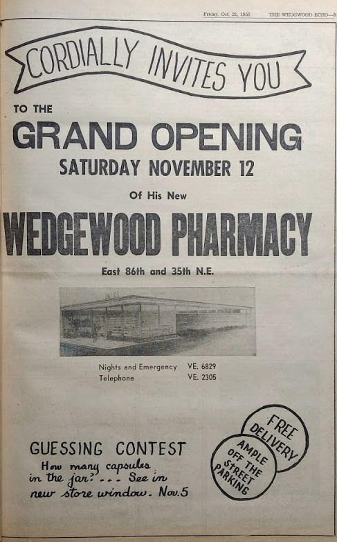 Wedgwood Echo community newspaper of October 21, 1955, announcing the opening events of the new pharmacy.