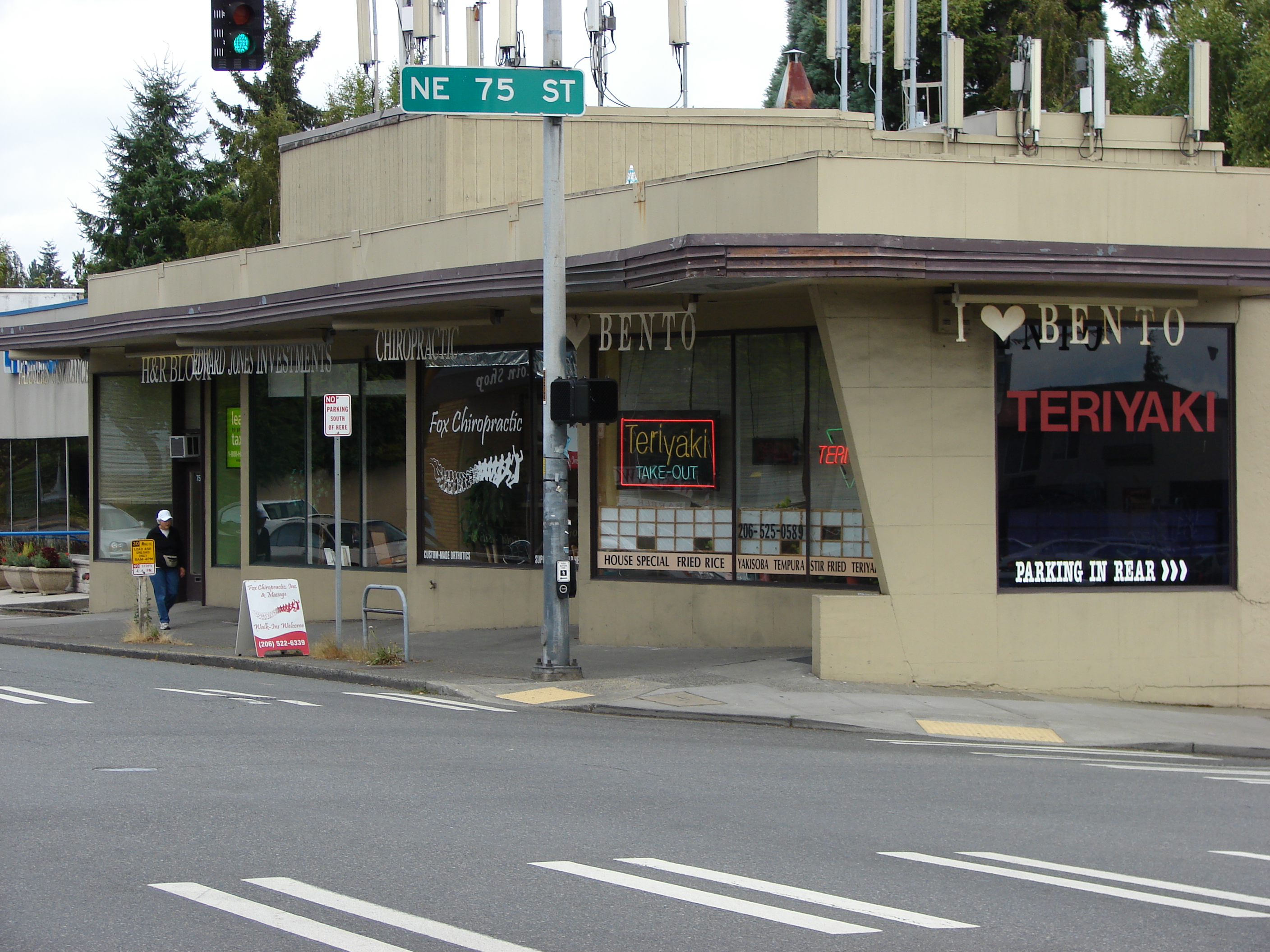 Above the 1950 storefronts of 7500 35th Ave NE can be seen the square outline of the former Ida’s Inn building which has been enclosed.