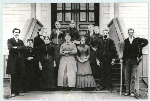Central School of Seattle: photo of the faculty taken on Opening Day, May 7, 1883. School Principal E.S. Ingraham stands at left. Mrs. Viola Kenyon is at center in the back row. Photo courtesy of Seattle Public Library Historical Photograph Collection.
