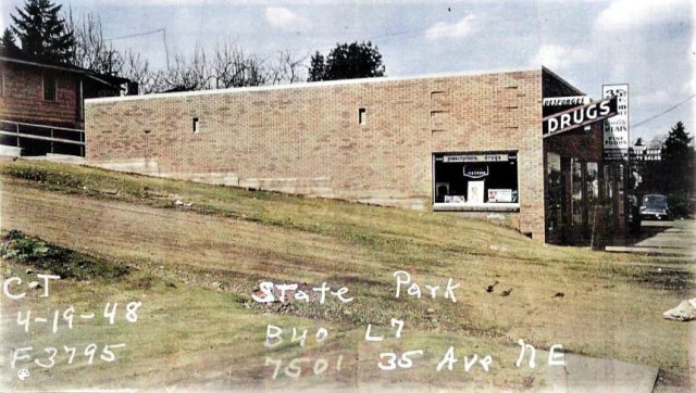 Original View Ridge Pharmacy building at 7501 35th Ave NE. After Mr. Cook’s house (at left) was moved, another section was added to this building.