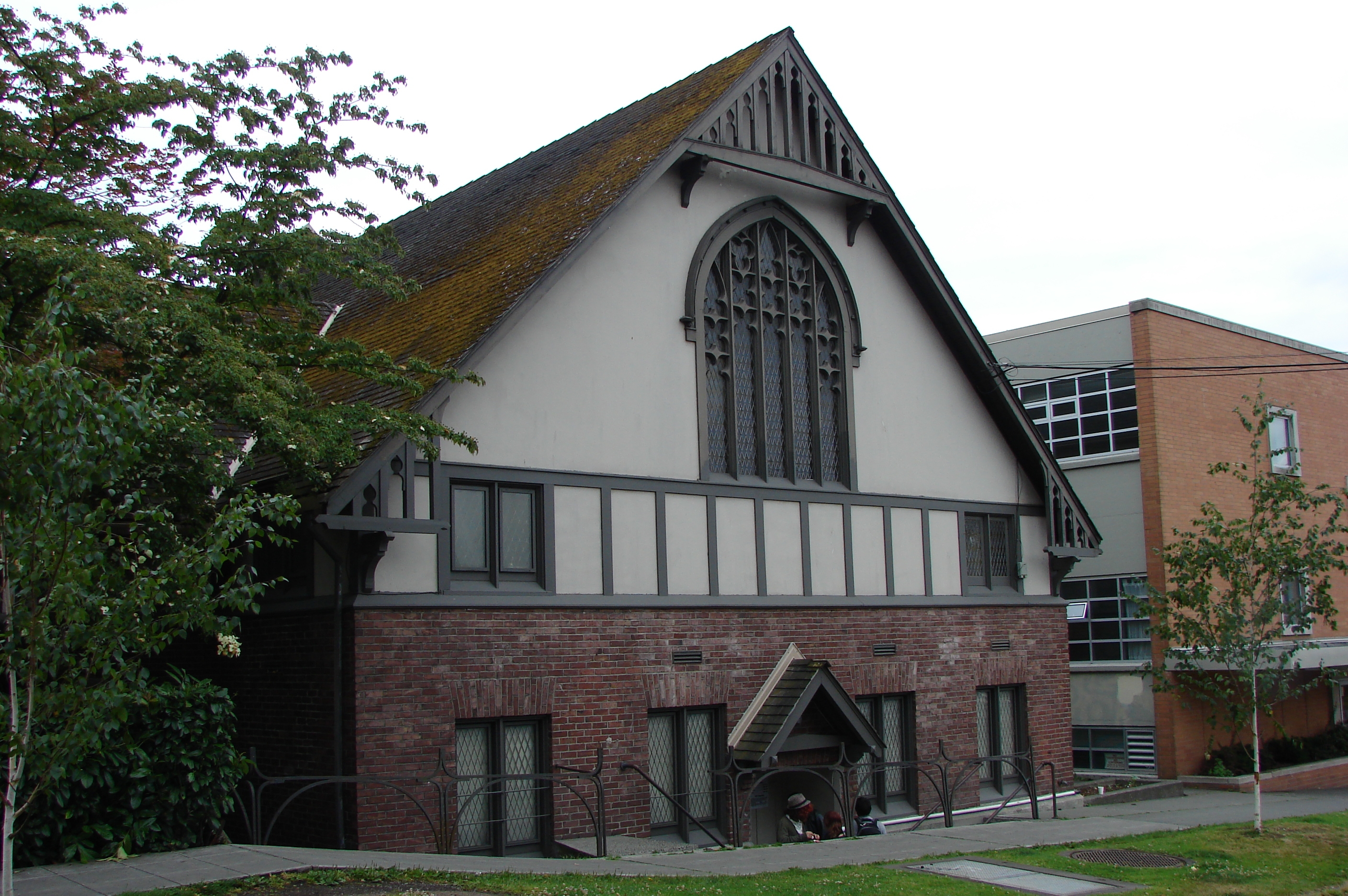 The University Unitarian Church’s first location was in this brick chapel (1916) on NE 47th Street between NE 15th and 16th Avenues NE, next-door to University Presbyterian Church. The site is now owned by University Presbyterian Church and is landmarked for historic preservation. Photo by Valarie.