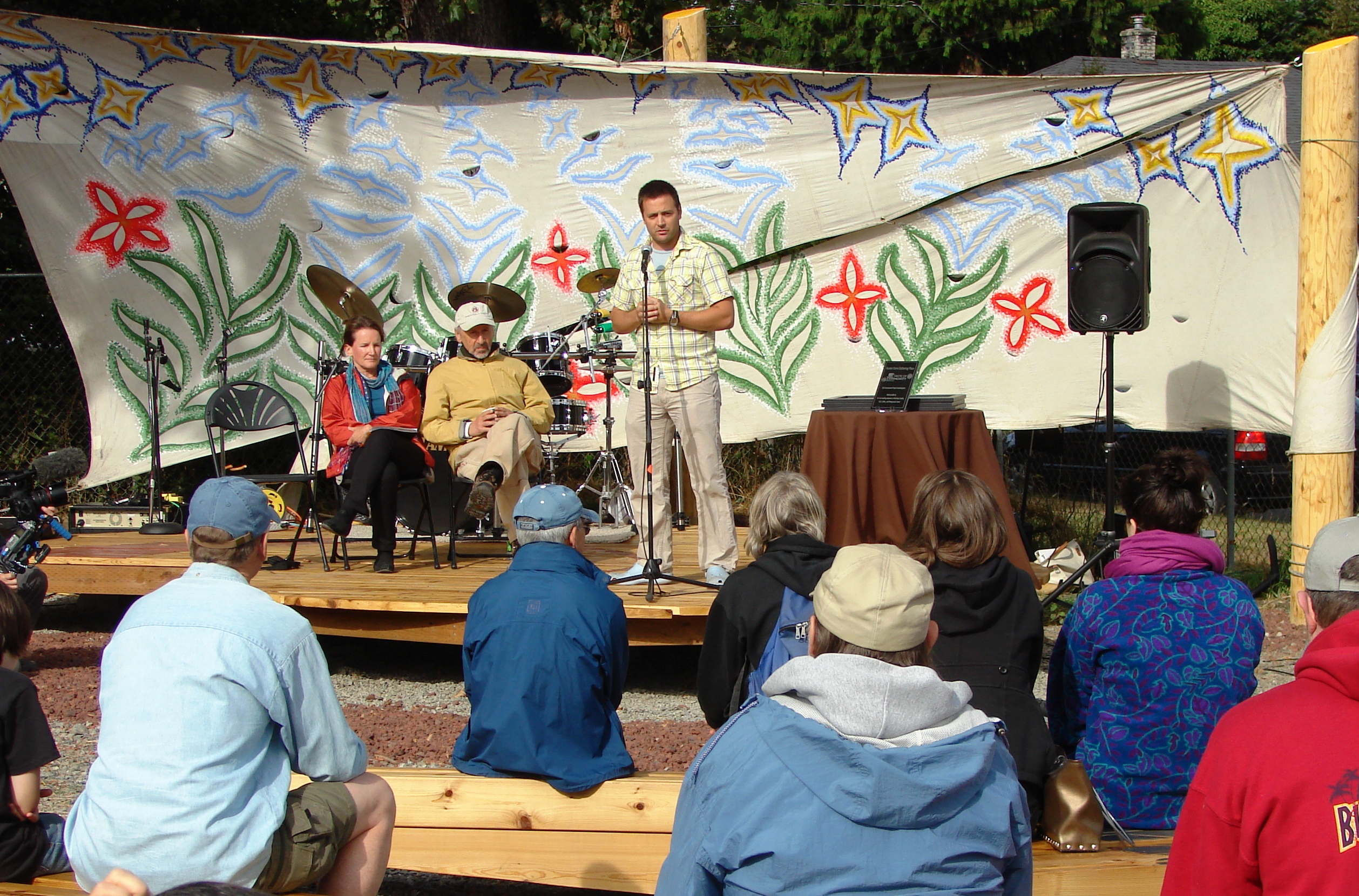 The Gathering Place Opening Celebration was held on September 17, 2011. Neighborhood volunteer coordinator Per Johnson thanked Tully’s Coffee for the financial underwriting and the Pomegranate Center for leading the design and build of the project.