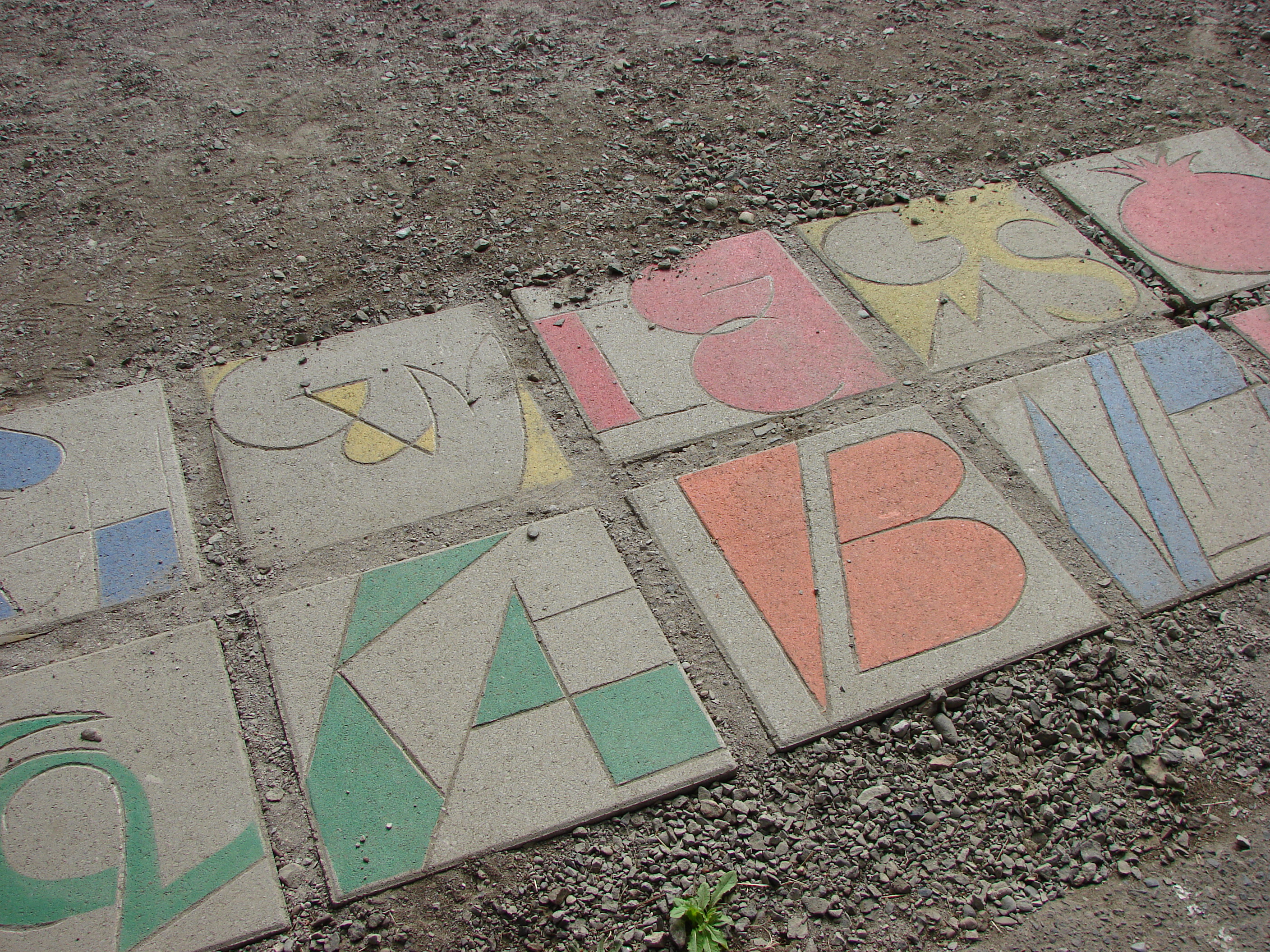 Functionality of the site was enhanced by building movable benches. Non-movable components such as the walkways around the Hunter Tree Farm sales kiosk in the center of the site, were improved by leveling the ground and defining the walkways with tiles. Donors had their initials inscribed and painted in the tiles, enlivening the cement walkways with color.