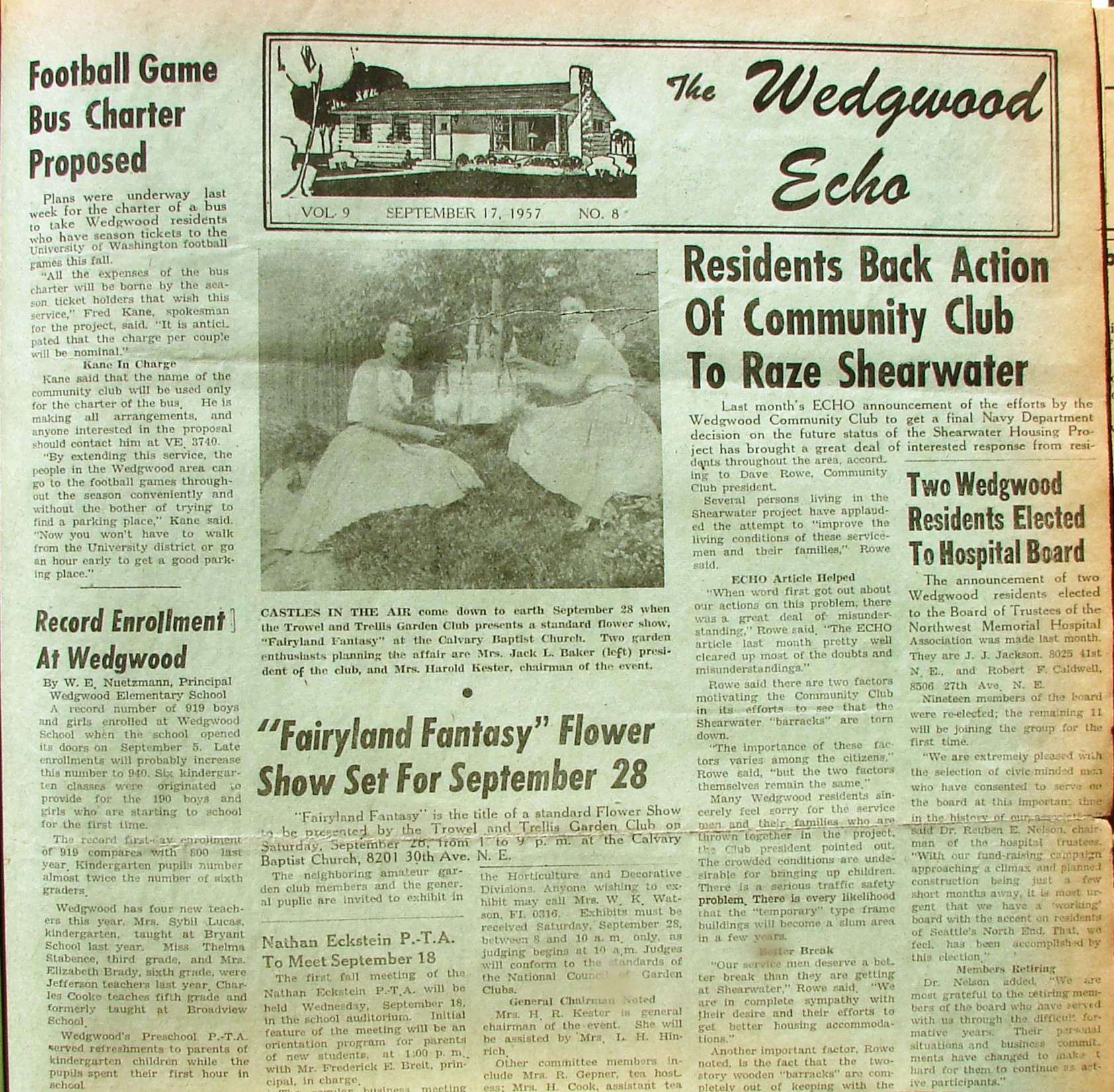 As of the September 1957 edition of the community club newspaper, it was thought that the Shearwater Navy housing would soon be torn down. Note the article at left, that the enrollment at Wedgwood School had hit a new high of 919 students. Wedgwood School first opened in 1953 with portable classrooms only. Decatur School opened in 1961.