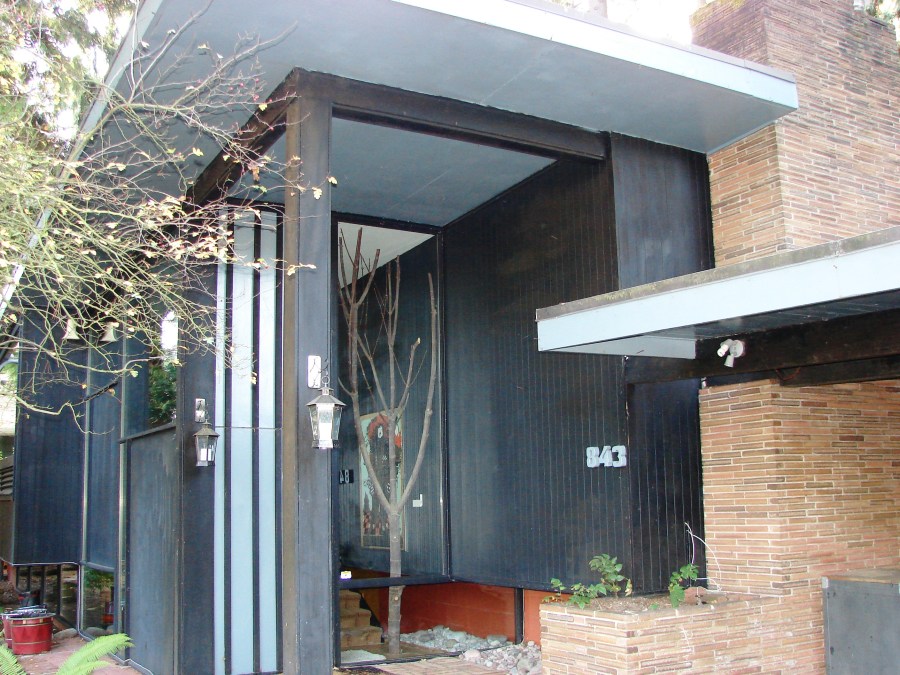 Geometric forms, flat planes and lines are characteristic of Northwest Modern architecture. The house at 843 NE 100th Street has a sloping roof supported by a post at the front corner, creating an entryway. A wall created by the brick fireplace divides the carport (to the right) from the entry space and the house.