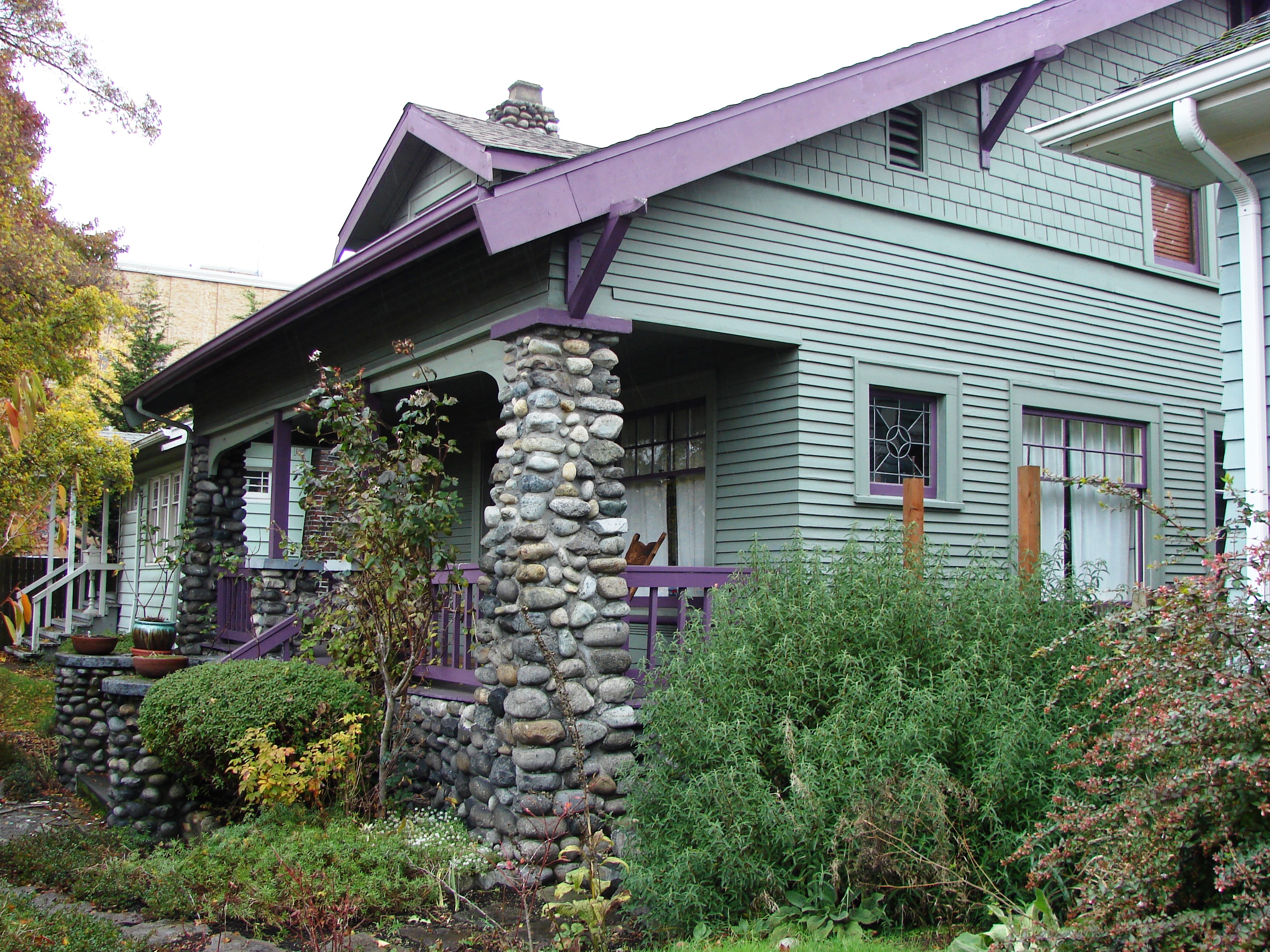 This Craftsman house built in 1911 shows the influence of the Arts and Crafts movement in its river rock front porch posts. The fireplace and chimney are of the same composition. The Craftsman movement included emphasis on fine woodwork and other “crafts” to make houses beautiful.
