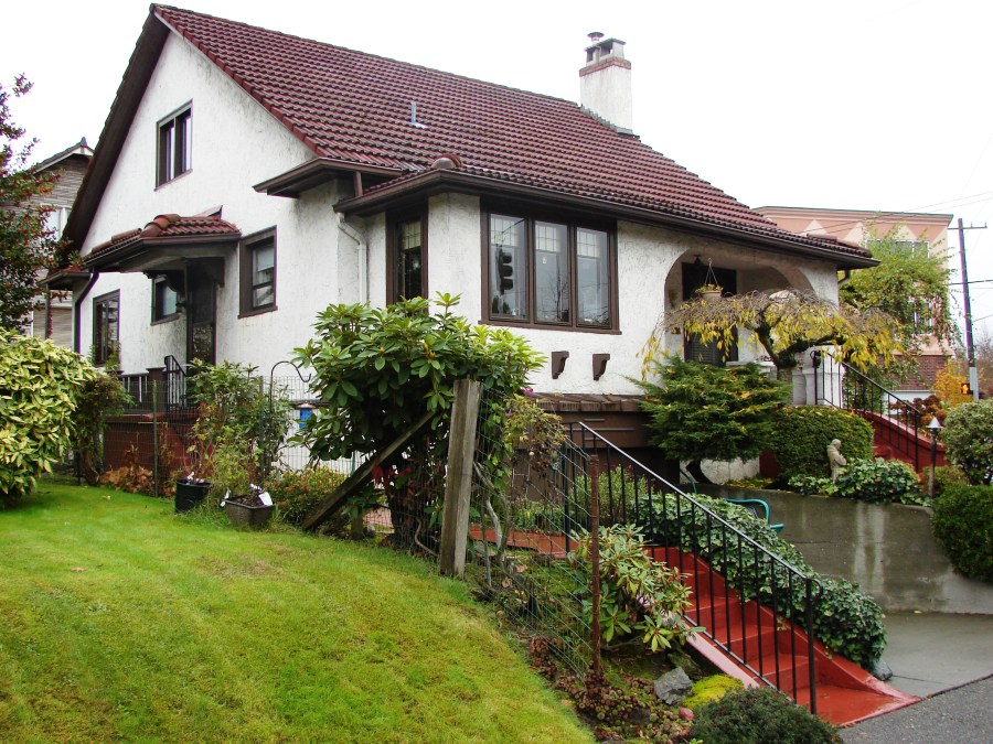 This house at Green Lake conveys its Spanish style with its stucco walls, red tile roof and front veranda.