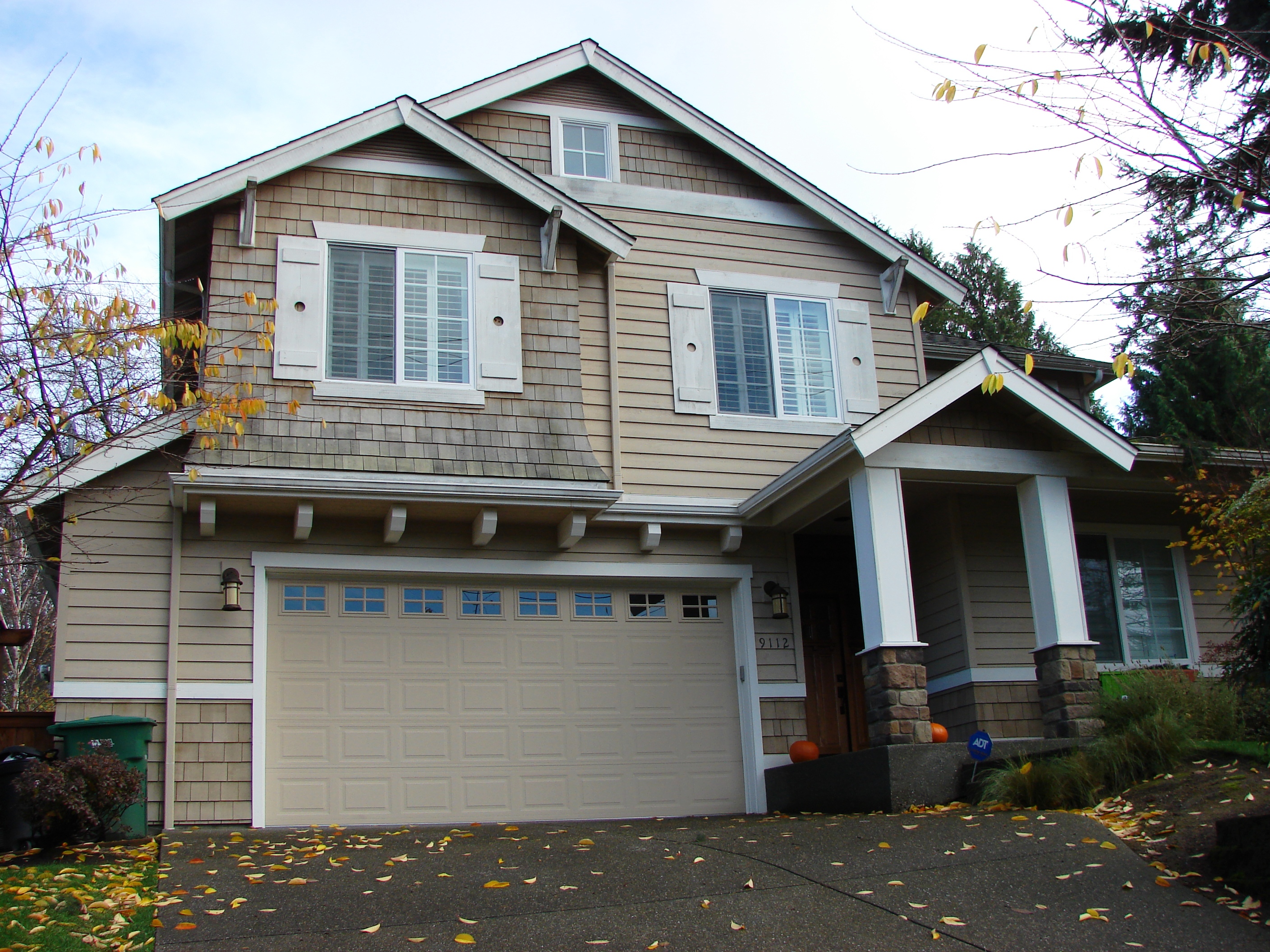 This 2008 house in Wedgwood seems to be trying to make as many cultural references as possible. The house has barge boards, knee braces under the eaves like a Craftsman house of the 1920’s, and (fake) exposed rafter tails coming out over the garage. The porch has a portico with columns and windows with munions and shutters which is a Colonial reference, and shingle-siding for Cape Cod is thrown in for good measure.