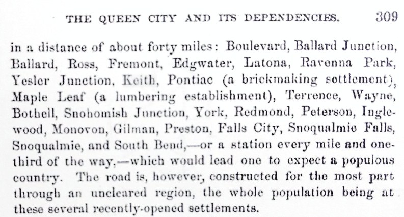 A tourism book of the year 1891 gave this list of the rail stops on the Seattle, Lake Shore & Eastern Railroad. See source list for book reference.