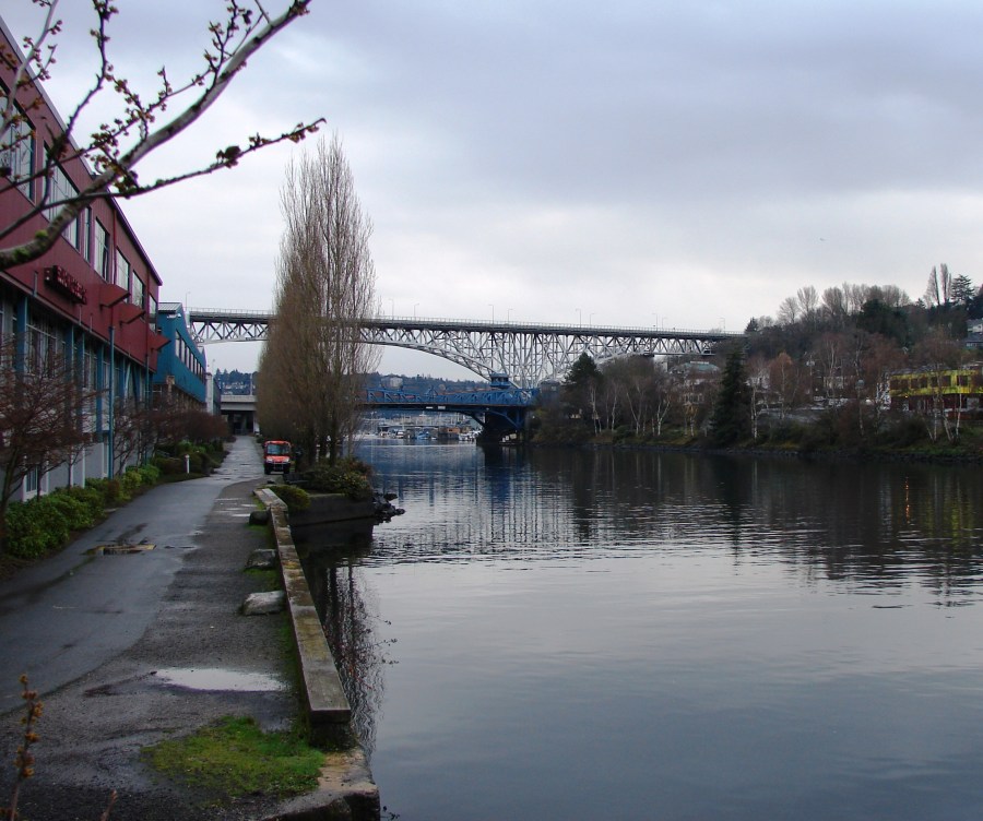 The Burke-Gilman Trail runs east-west parallel to the Ship Canal through the Fremont neighborhood. This view eastward toward the Fremont and Aurora Bridges was taken from the Trail.