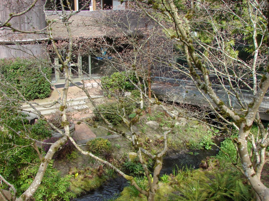 Willow creek runs past the building on the former Oriental Gardens nursery site. The building has a patio at creekside. Photo by Valarie.