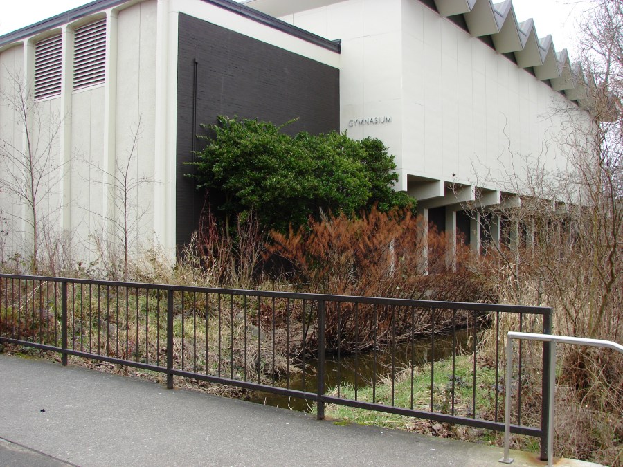 A branch of the Thornton Creek system has been channeld past Nathan Hale High School with footbridges across it.