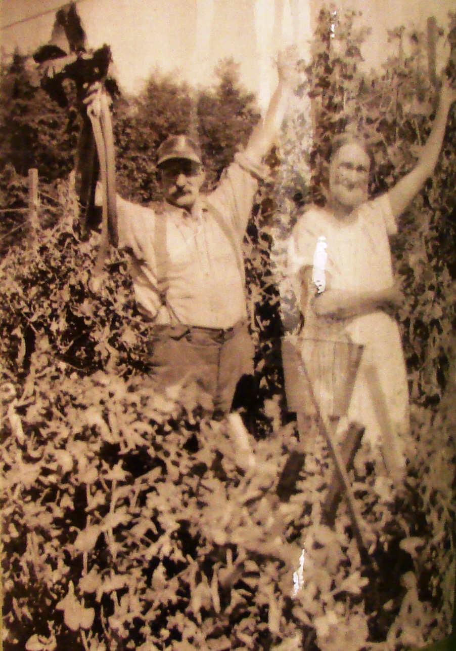 Roy and Anna Land with their garden produce in the 1930s. Mr. Land is holding up a bunch of rhubarb. In the 1930s people tried to live as cheaply as possible by growing and canning food.