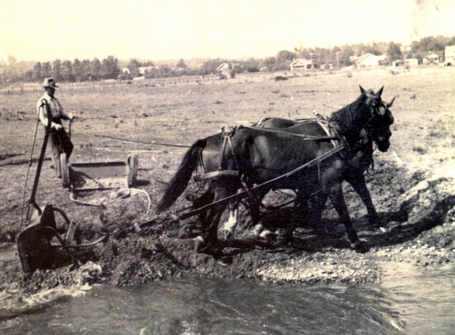 In this 1930’s photo of Meadowbrook Golf Course we are standing with our backs to the hill, looking north to the present site of Nathan Hale High School. Workmen are trying to improve drainage by dredging a channel at the base of the hill.