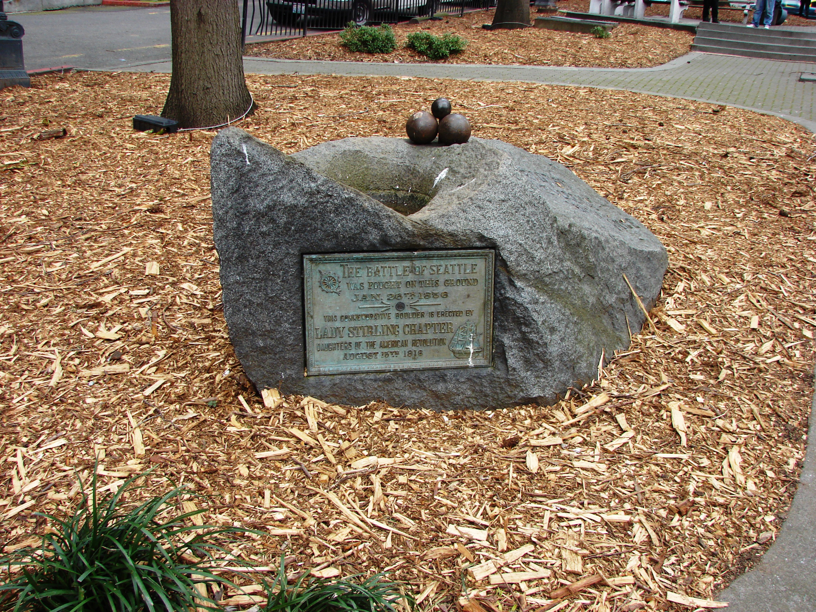 The Battle of Seattle is commemorated with this marker on one of the blockhouse sites, Third & Jefferson in today’s downtown Seattle.