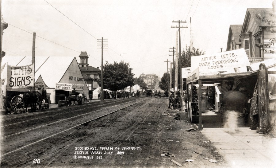 The large white tent at left is that of Doheny & Marum, advertising clothing and household goods in the month after Seattle’s Great Fire of 1889.