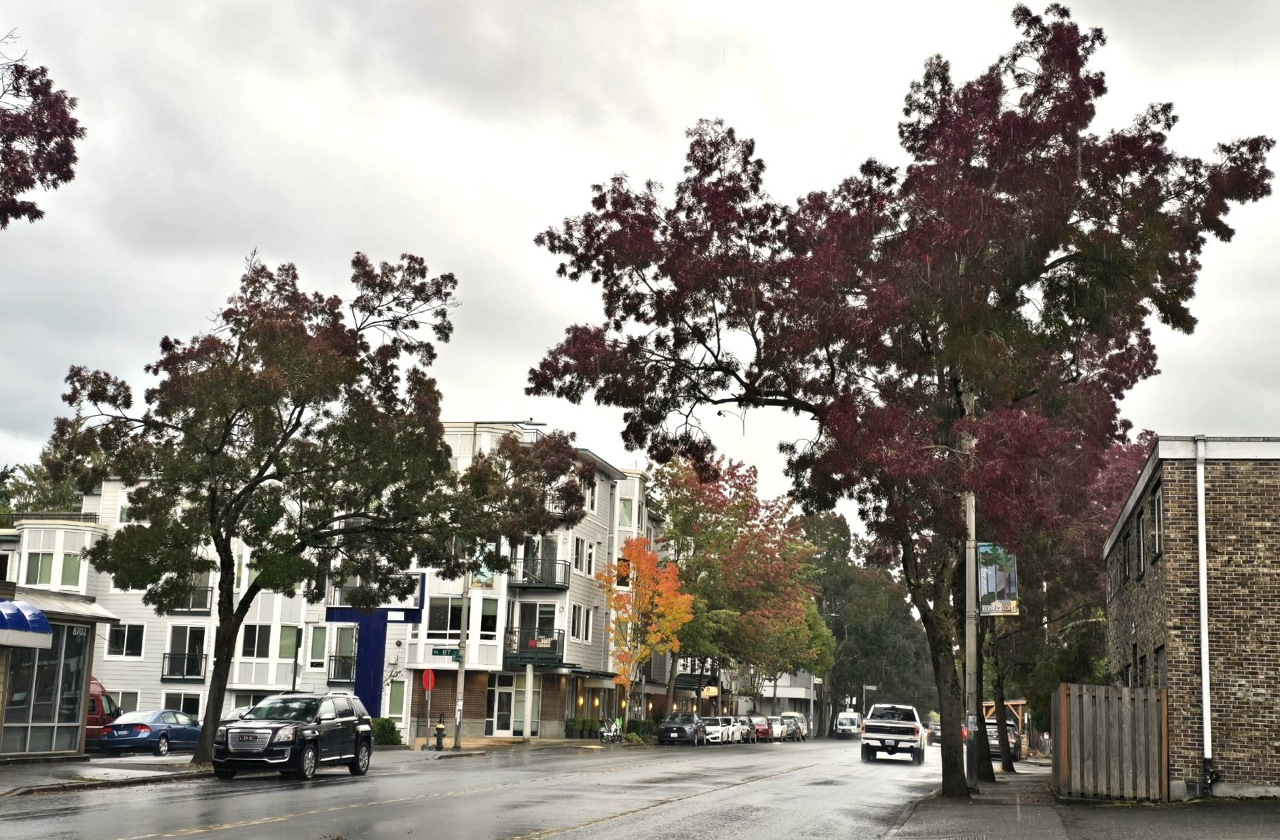 Flame ash street trees in Wedgwood at the corner of NE 87th Street, looking southward.