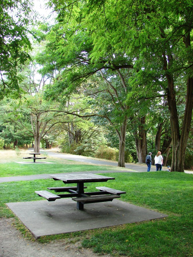 Picnic tables and a path to the Metropolitan Market grocery store are adjacent to the Burke-Gilman Trail just off of 40th Ave NE.