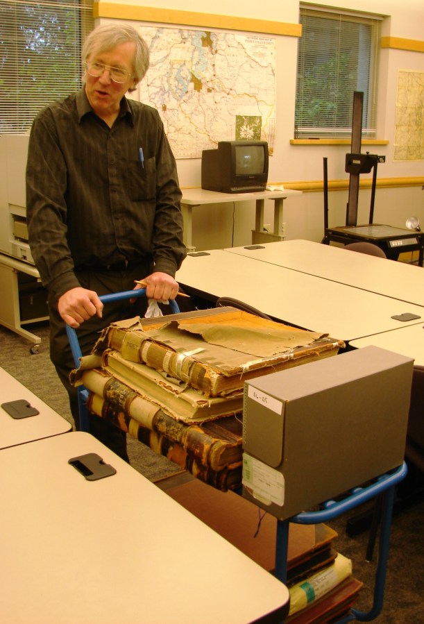 Original King County record books like these tattered journals are kept in temperature-controlled vaults at the Puget Sound Regional Archives in Bellevue. Books can be brought out on a cart to be opened in the research room, as I did to search for Keith family land transactions.