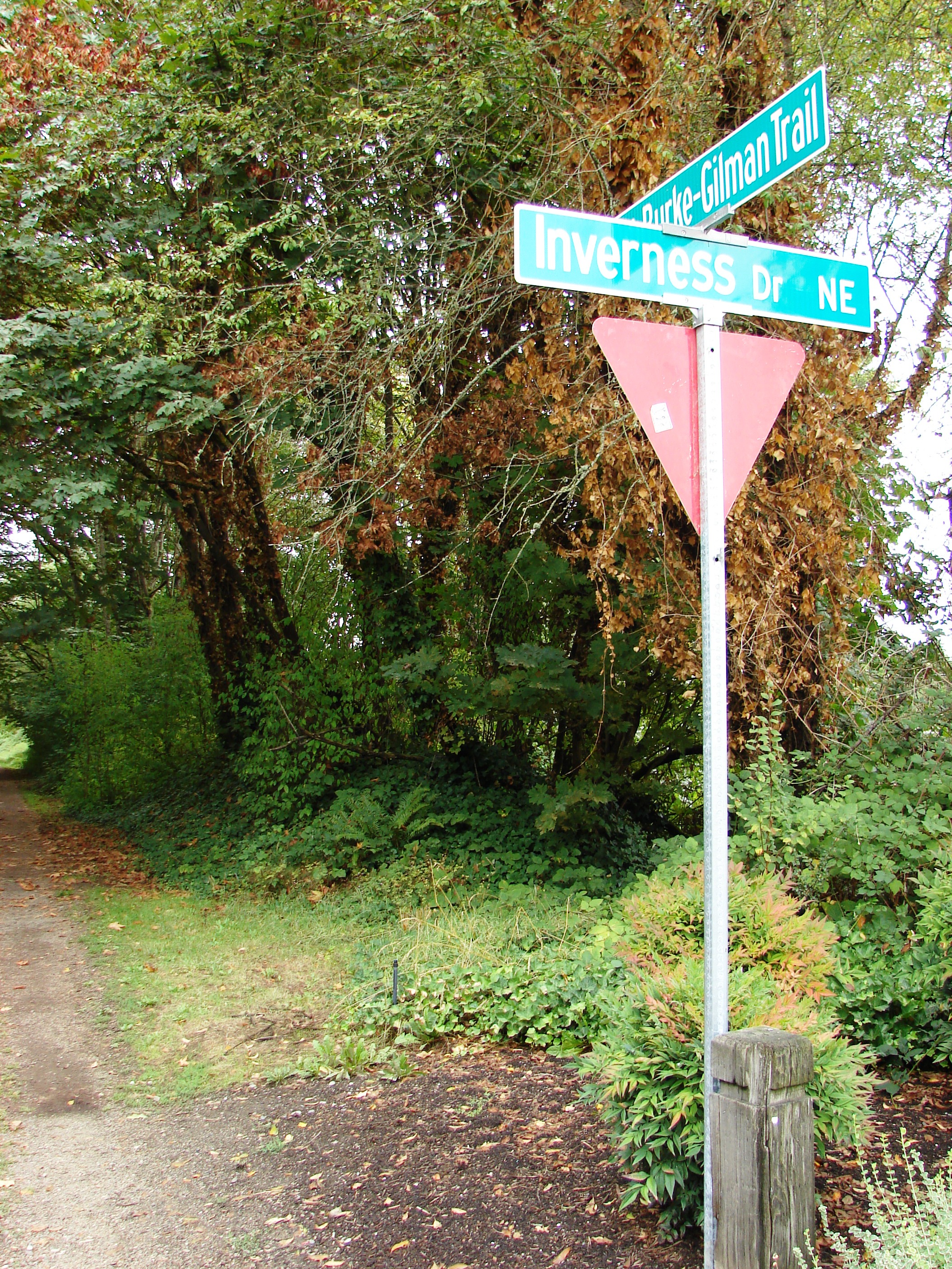 Looking north on the Burke Gilman Trail where it crosses the entrance driveway to Inverness. In the time that I stood watching bicyclists on the Trail, none slowed down to see whether any cars were coming across. Photo by Valarie.