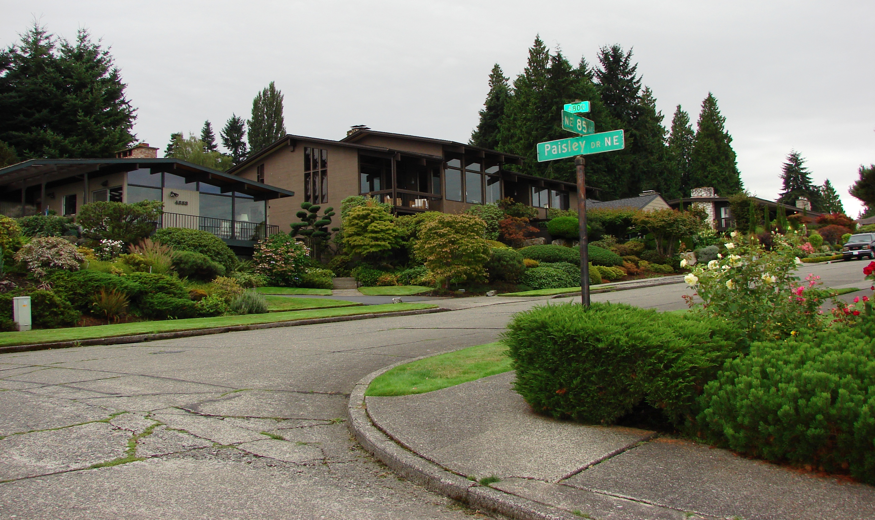 The Inverness neighborhood is located in northeast Seattle between NE 85th to 90th Streets, 45th Ave NE to Sand Point Way NE. Inverness is on a very steep hillside which had no houses or any kind of development until 1954. During that post-World-War-Two time period, there was a boom in housebuilding in yet-undeveloped areas of northeast Seattle. Despite the difficulties of the steep slope, in that time a developer started building the Inverness houses.