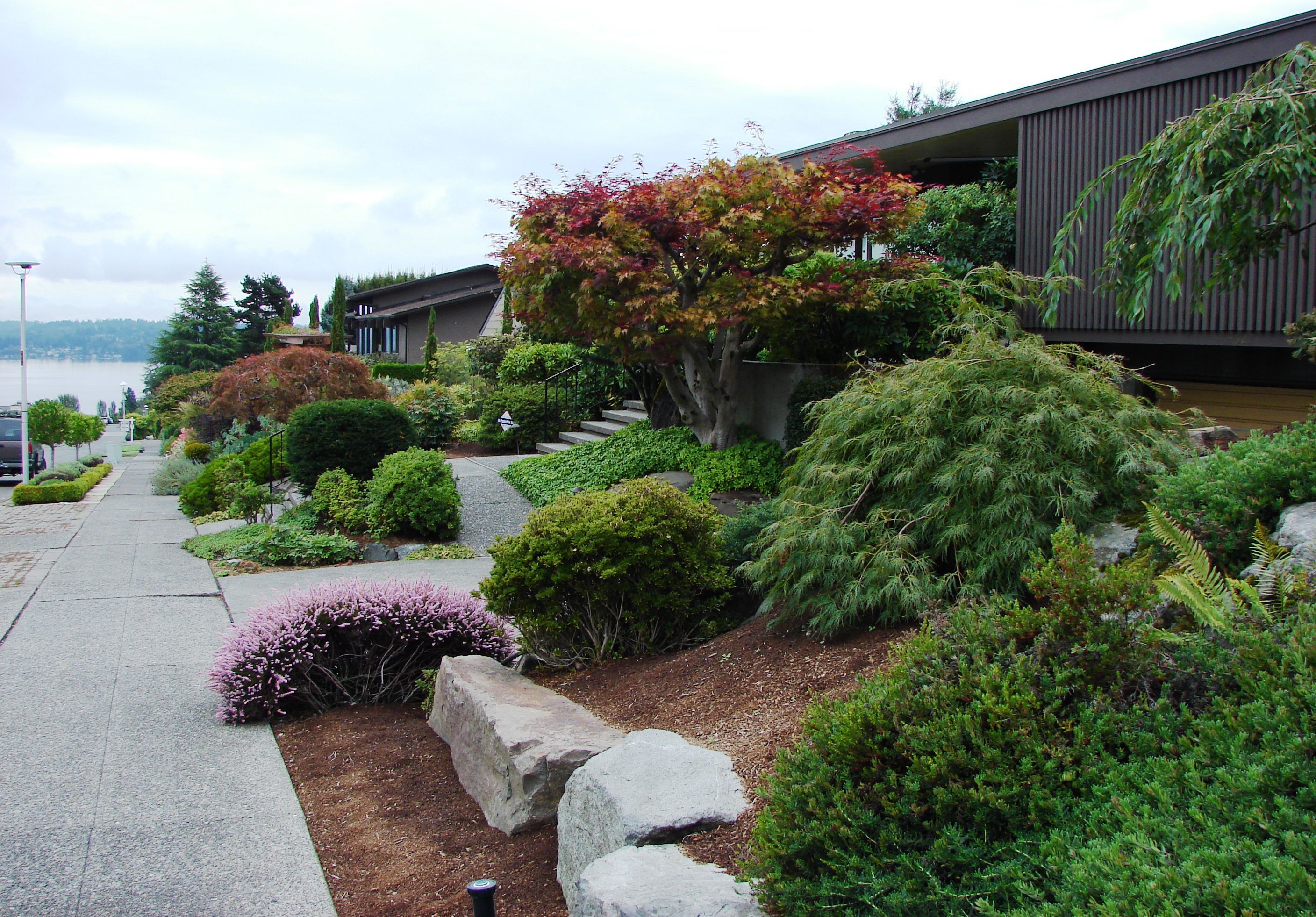 The houses near the entrance to Inverness just off of Sand Point Way NE shows how steeply the streets of the development climb, and that the houses are set up on high points.