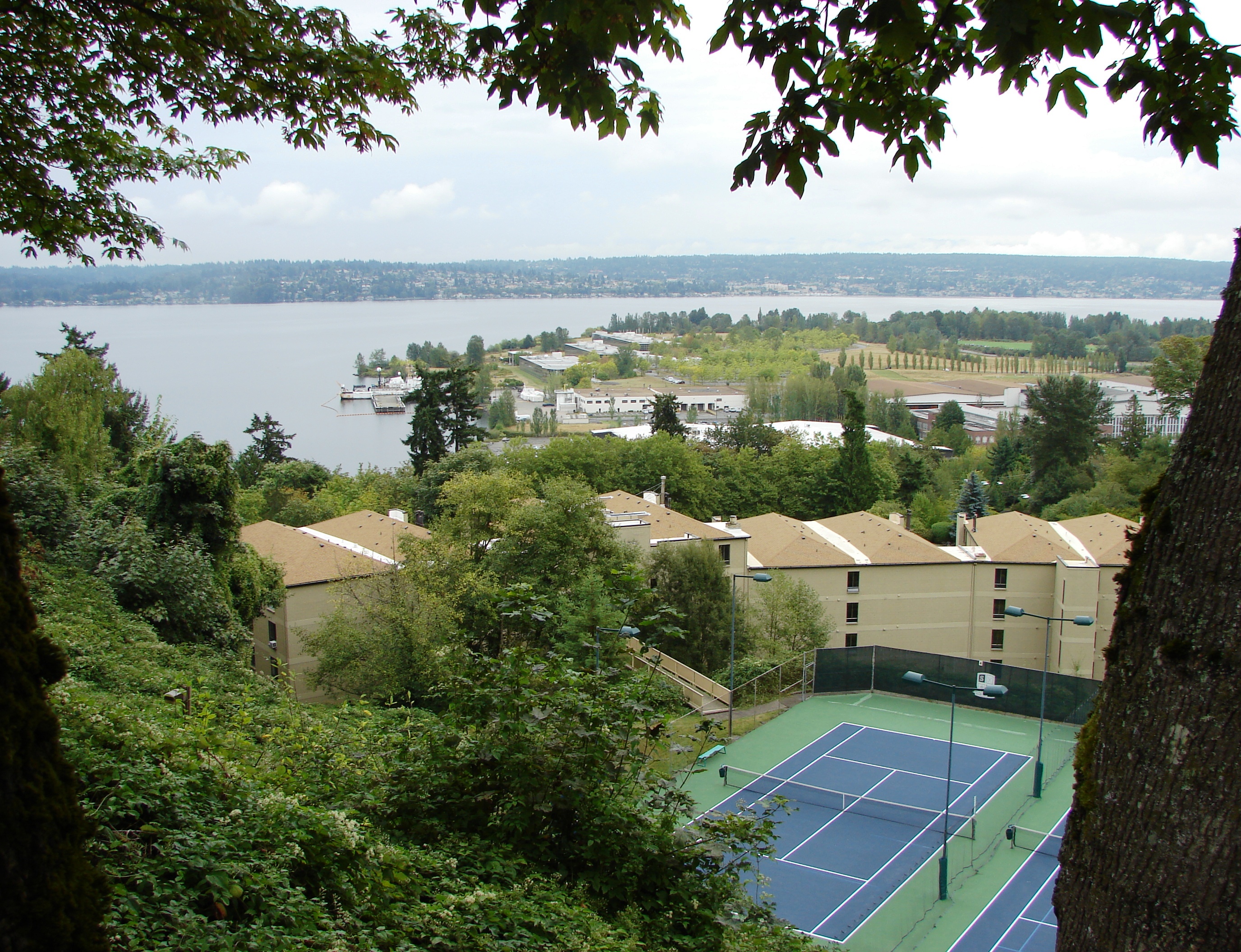 From the cliff edge of the Sand Point Country Club golf course looking southeast, we see their tennis courts below and the Fairview Estates condominium buildings, with Magnuson Park and Lake Washington beyond. Photo by Valarie.