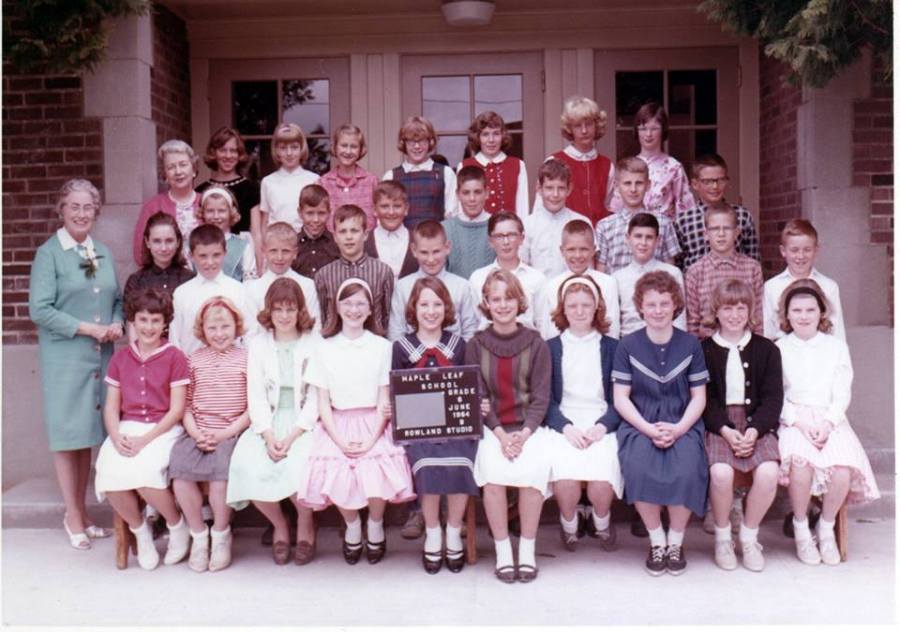 Maple Leaf School Sixth Grade, June 1964. Teacher Miss Jane Dayton (in blue) and Principal Katherine Maxwell (pink.) Valarie is in the back row, far right end. Photo courtesy of Philip Cereghino.