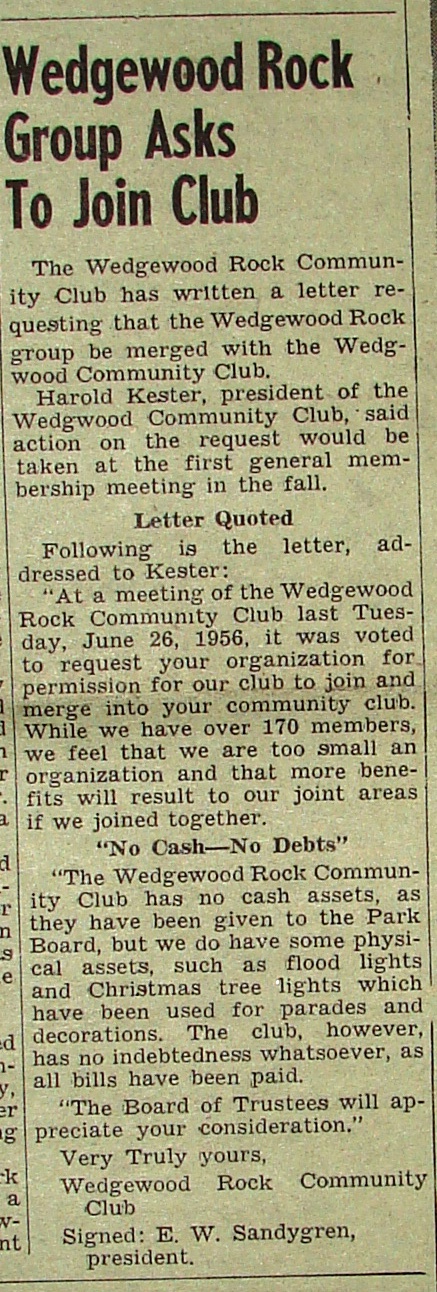 In a Balch development south of NE 75th Street between 25th to 30th Avenues NE, the neighborhood group called itself the WedgEwood Rock Community Club. In June 1956, this club with 170 members requested to merge with the main Wedgwood group. (See the letter of request at the end of this page.)