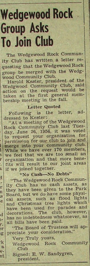 This letter from the Wedgewood Rock Community Club was printed in the Wedgwood Community Club newsletter, the Echo, in June 1956.
