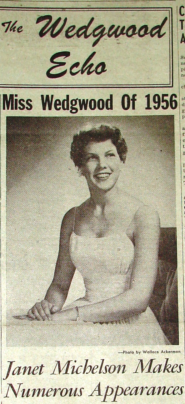 In the 1950s and 1960s the Wedgwood Community Club (WCC) was busy dealing with issues of city limits, zoning, street improvements, establishment of a business district and needed services such as schools and postal delivery. The Club was proud of the developing community, and the WCC president of 1955-56, J.J. Jackson, thought of another way to publicize Wedgwood. He noted that “princess” candidates from Seattle neighborhoods competed each year to be chosen Queen of the Seas at the summer festival called Seafair. Jackson proposed, “let’s have a ‘Miss Wedgwood” contest!”