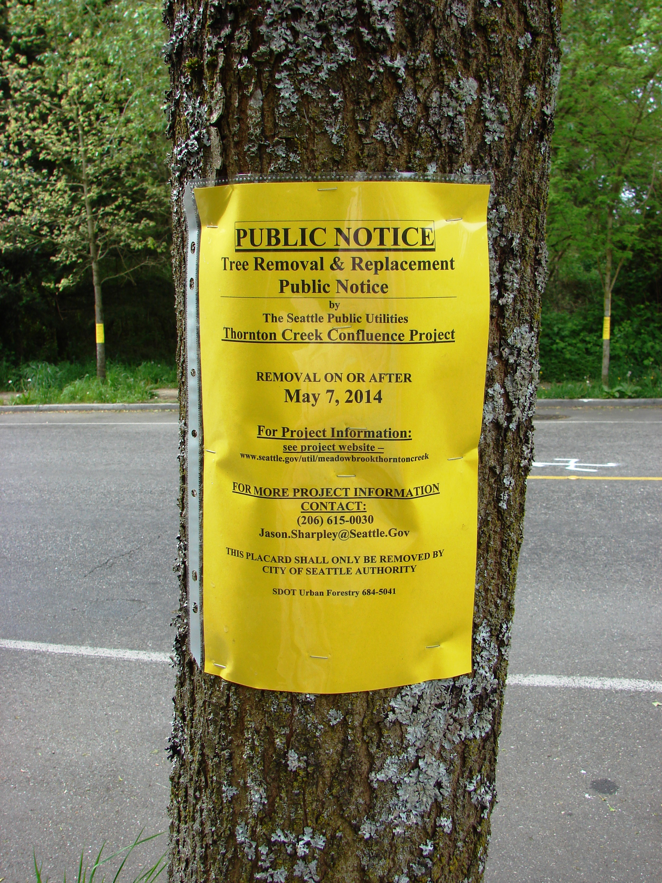A very large number of trees will have to be removed at NE 107th Street on both sides of 35th Ave NE, because they have become too big and are choking and narrowing the creek channel. This includes the poplar trees along the creek on the west side of 35th Ave NE, going toward Nathan Hale High School; the willow tree in the empty lot on the east side at about NE 107th Street; and a few of the flame ash street trees at that point where new culverts will be put in underneath 35th Ave NE.
