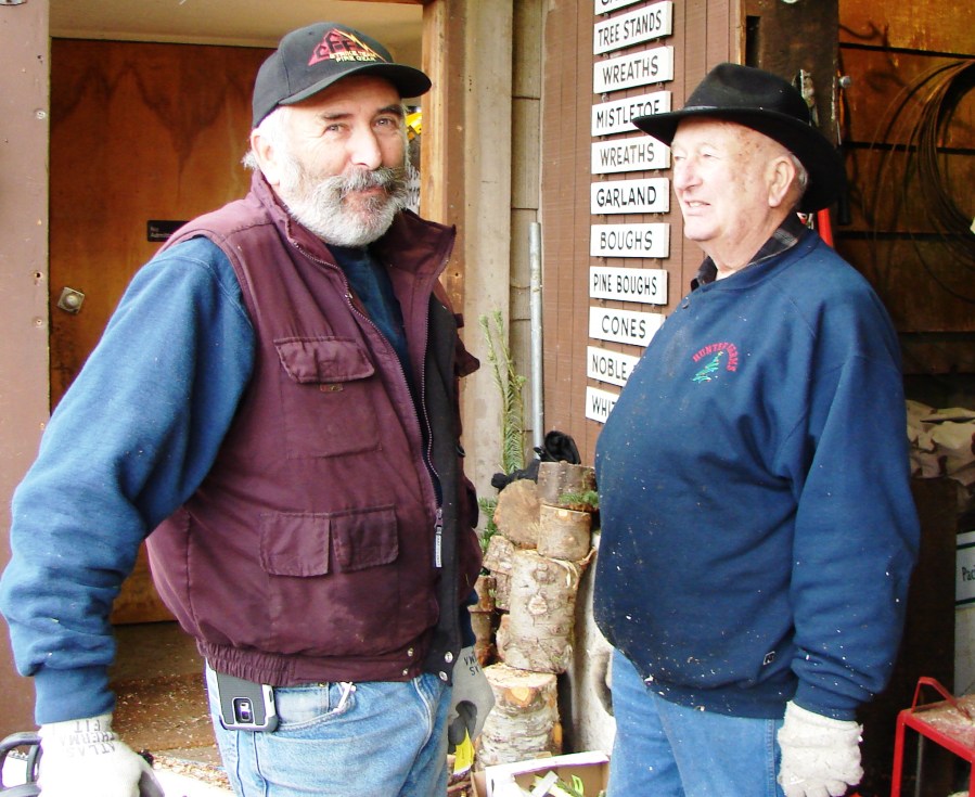 Bill Hunter Jr. with his father, William O. Hunter Sr., work together at the annual Christmas tree sales in Wedgwood.