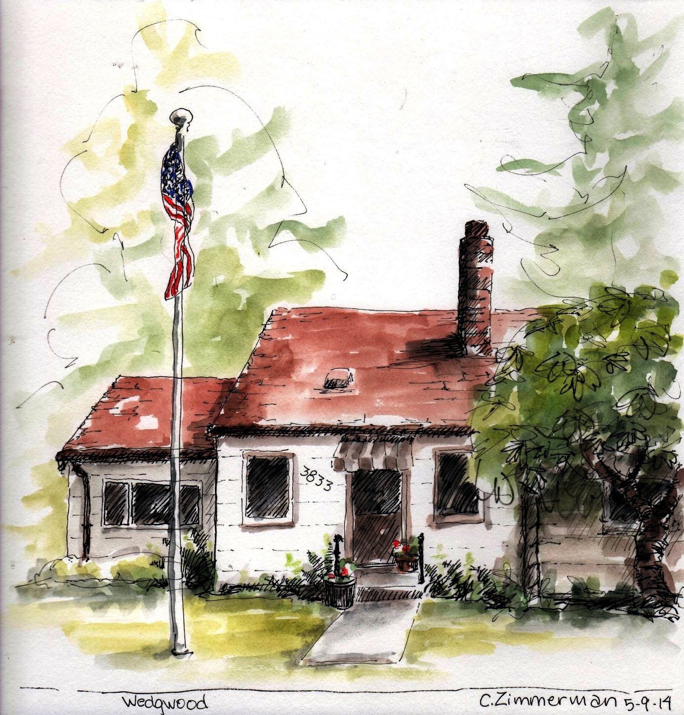 House sketch by Seattle Urban Sketcher Carleen Ormbrek Zimmerman. Used with permission; do not copy.