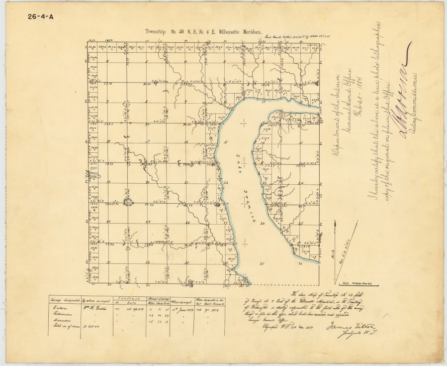 In 1858-1859 William H. Carlton led a survey team and drew this map of Township 26, north Seattle from 85th to 205th Streets.