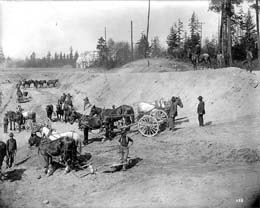A crew using horse-drawn grading equipment prepared the grounds of the AYPE on the UW campus, Seattle, in 1908. Photo by Frank H. Nowell, UW Special Collections Image Number AYP522.