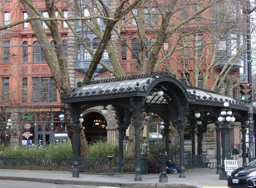 The sheltering structure of the Pioneer Square Pergola (foreground) was set up in 1909 for people waiting for the streetcar out to the AYP in northeast Seattle..
